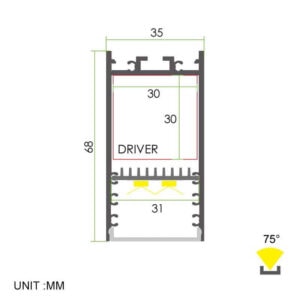 מקור הואר שקוע עמוק בגוף למניעת סנוור, מגיע עד UGR<6.